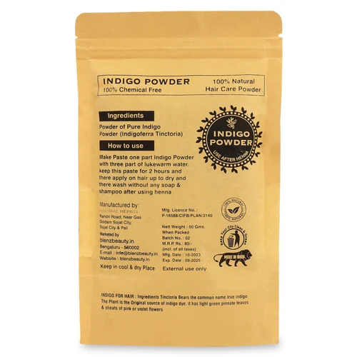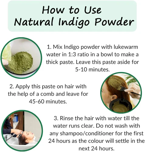 IngredientsPowder of Pure Indigo Powder (Indigoferra Tinctoria)How to useMake Paste one part Indigo Powder with three part of lukewarm water.keep this paste for 2 hours and there apply on hair up to dry and there wash without any soap & shampoo after using henna