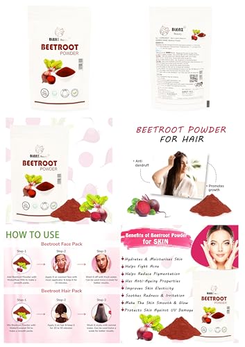 KEY INGREDIENT:Beta Vulgaris (Beetroot)GENERIC NAME: Beetroot PowderUSAGE:Take 20 gm of Beetroot Powder and add 100 ml of water to make a paste. You could add oils for added benefits. For Skin: Take the paste and directly apply with your fingers. Keep it on for 15-20 mins. Rinse with water & pat dry. Some powders tend to stain, use of gloves is recommended. For Hair: Use a thin-toothed comb for parting hair into branches and apply the paste from roots to the tip with a brush. Let the scalp and hair absorb the paste thoroughly. Leave the paste on the hair for at least 60 minutes. For best results, it is recommended to leave it on for 3 hours or more. Wash with water until rinsing water becomes clear. Wash again with a mild shampoo. Let it dry and set as requiredCAUTION:Natural ingredients may be irritating to some people. Always conduct a patch test before use. Keep away from the reach of children. In Case of contact with eyes, wash with water immediately. Store in a cool, dry place.For external use